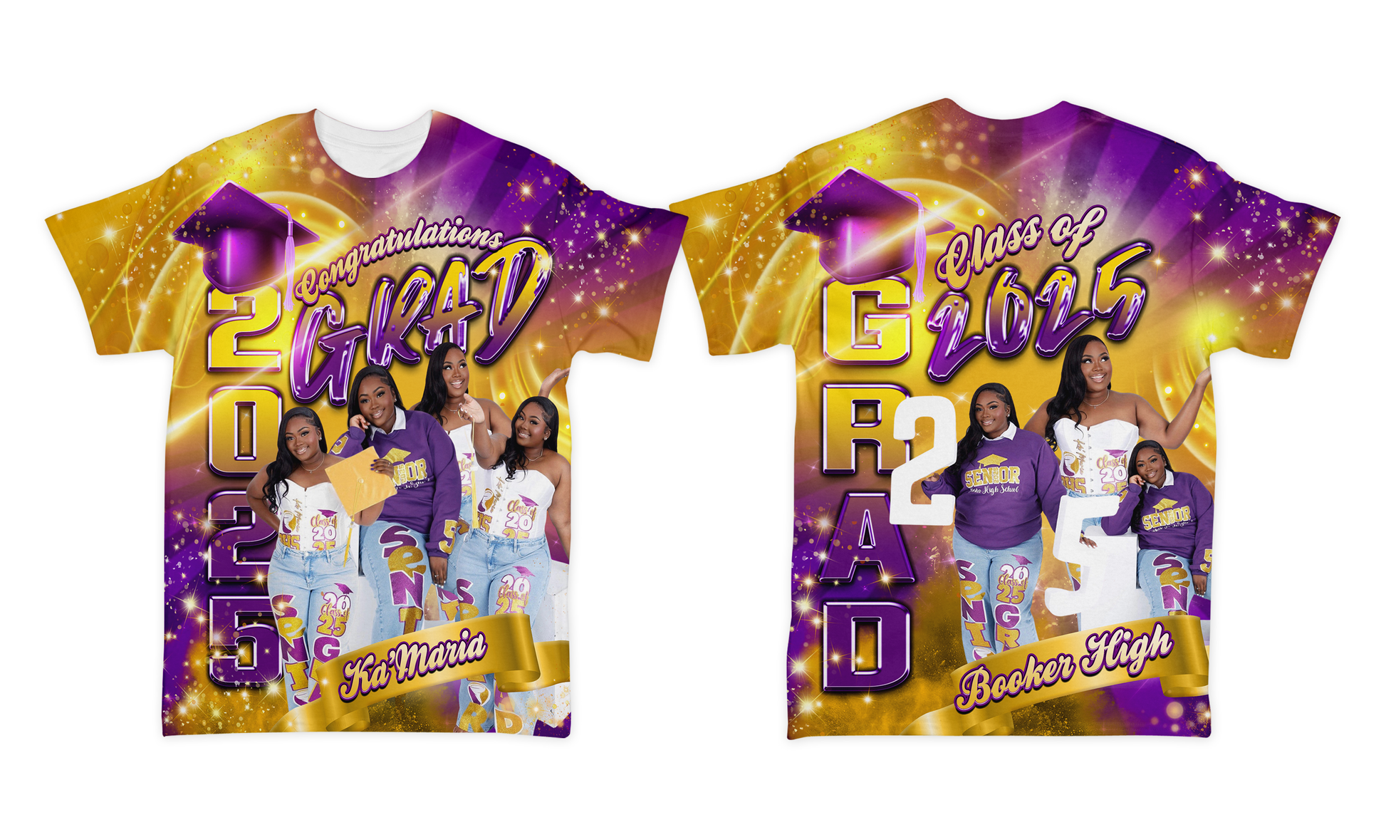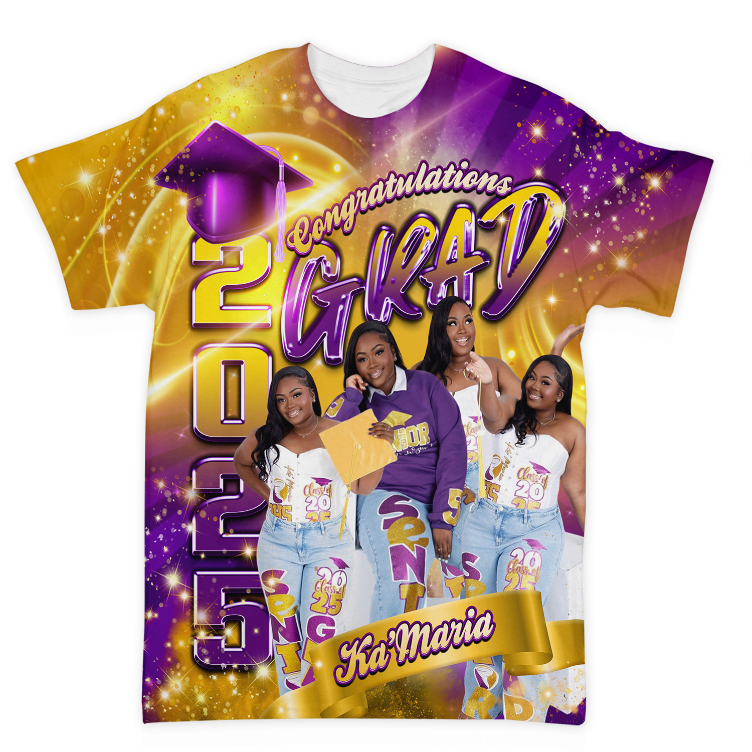 Celebrate your graduate in style with this customized Class of 2025 graduation T-shirt! Featuring a vibrant Sublimation print, this tee is made from 100% polyester for a lightweight, breathable, and comfortable fit—perfect for the big day.