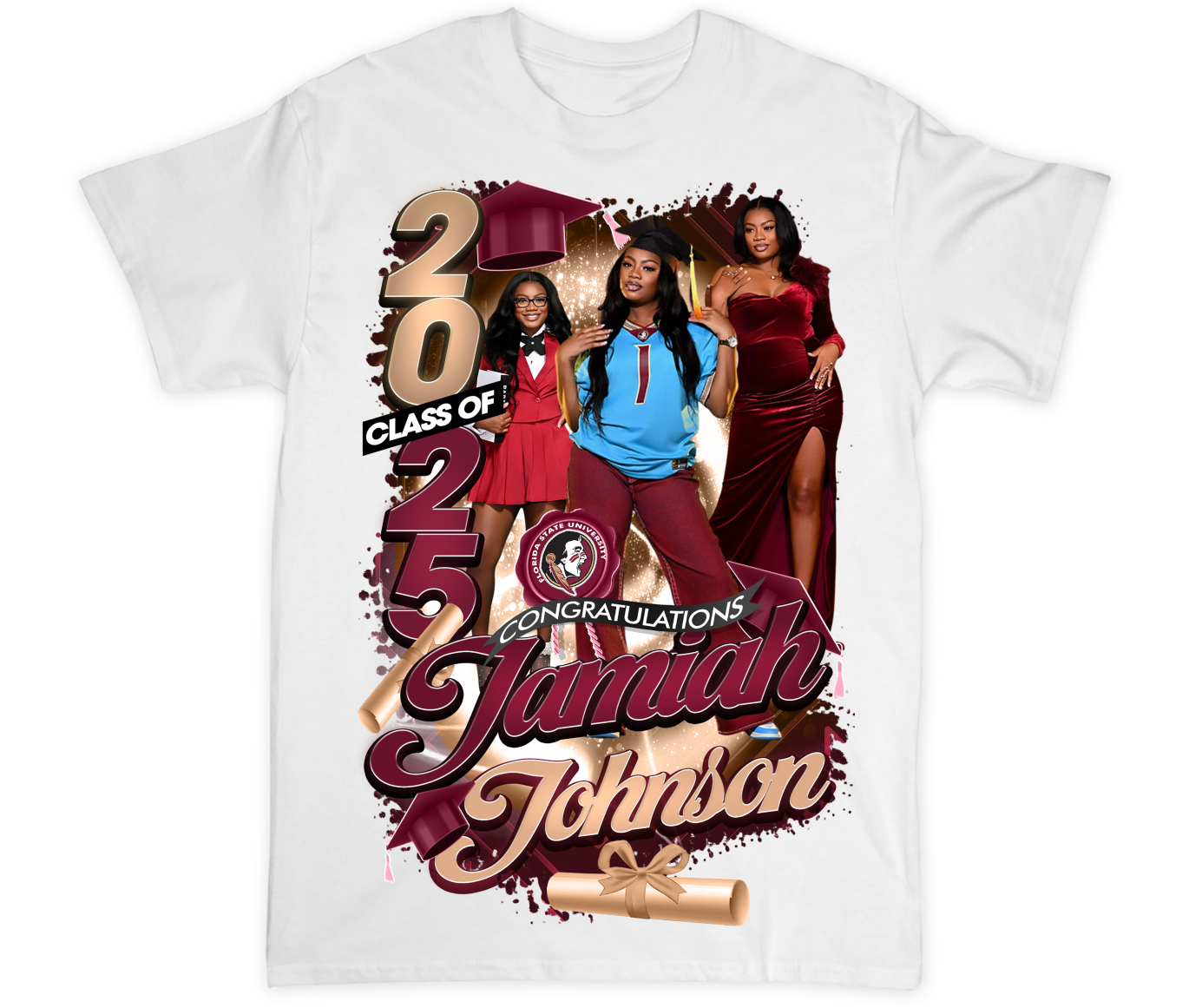 Celebrate your graduate in style with this customized Class of 2025 graduation T-shirt! Featuring a vibrant sublimation print, this tee is made from 100% polyester for a lightweight, breathable, and comfortable fit—perfect for the big day.